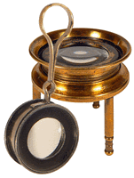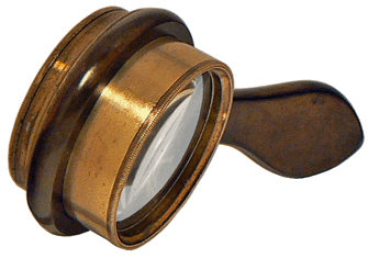 L'expérience montre que les contours des images données par l'utilisation d'un système de deux lentilles présentant des courbures moindres que celles d'une lentille unique de même puissance, permet d'obtenir des images moins irisées. Pour cette raison, la partie optique de notre loupe est formée par deux lentilles plan-convexes de 5,5 centimètres de diamètre disposées parallèlement et à faible distance l'une de l'autre. Le manche en corne est légèrement incurvé ce qui permet une bonne préhension de l'instrument dont la longueur totale est égale à 16,5 cm. |