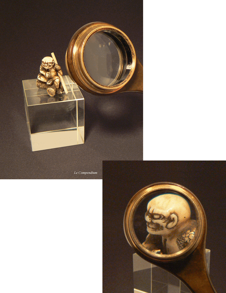 Cette petite sculpture en ivoire est un netsuke, typiquement japonnais. Sa hauteur est égale à 3,5 cm. Les deux photographies sont réalisées à la même distance de la loupe afin de faciliter l'évaluation du grossissement obtenu. Cette position en recul permet ici, en réduisant la surface observée, d'éviter de rendre visibles les distorsions à la périphérie de l'image ... |