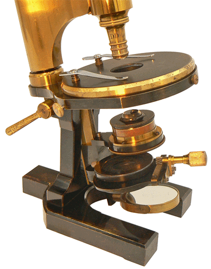 Le microscope semble être le grand modèle "Stand I" présenté dans le catalogue Zeiss de 1891. Toutefois, une platine circulaire mobile de 11 cm de diamètre a remplacé, au cours de sa vie en laboratoire, celle d'origine plus large de 1 cm. |