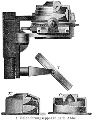 La figure ci-dessus, empruntée à l'ouvrage de Langeron, correspond à la mesure de l'épaisseur d'une lamelle. Elle accompagne une description particulièrement claire : La partie gauche nous montre l'objectif mis au point sur E, dans le plan supérieur de la lamelle. Pour mettre ensuite au point sur le plan inférieur, il semblerait qu'on doive l'abaisser de la quantité ED, mais en réalité il suffit de le déplacer de la quantité ED' car, après réfraction, les rayons partis de D paraissent suivre le trajet BD'. Pour connaître l'épaisseur réelle de la lamelle, il faut multiplier la différence entre les deux chiffres lus sur la vis micrométrique par l'indice de réfraction du verre de cette lamelle. |