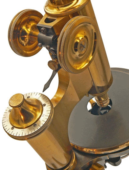La tête de la vis micrométrique porte une graduation, en regard de la pointe d'un index fixe, permettant d'apprécier un déplacement vertical de 0,01 mm du tube optique. Le dispositif est utilisé pour mesurer une épaisseur. Comme le souligne Langeron dans son PRÉCIS DE MICROSCOPIE (édition de 1934), l'opération est un peu plus compliquée que la mesure des longueur à l'aide du micromètre objectif. D'abord, il est assez difficile de déterminer exactement le plan supérieur et le plan inférieur d'une coupe ou d'un objet microscopique. Ensuite, il faut tenir compte du phénomène de réfraction lorsqu'on se sert d'un objectif à sec... |