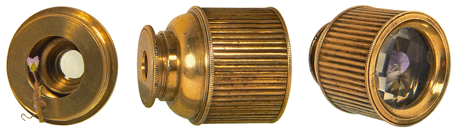 Ce microscope simple est davantage un divertissement qu'un instrument d'observation. Nous y avons placé une minuscule plante, la Véronique petit-chêne. La lentille plan-convexe multifacettes se comporte comme un ensemble de sources lumineuses de faible intensité dont certaines, les plus éloignées du centre, éclairent le sujet de biais. Mais cela n'est possible que si l'objet ne couvre qu'une partie réduite du champ car la lumière ne contourne toujours pas l'obstacle pour éclairer la face observée, même dans l'élégant microscope de Blackhall !