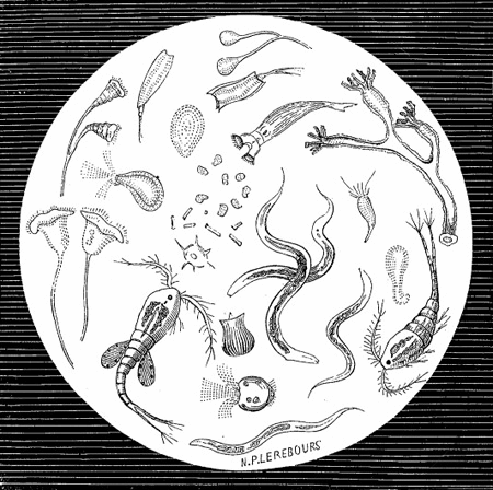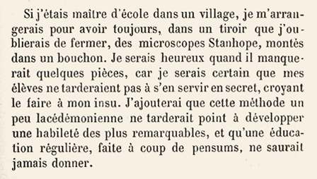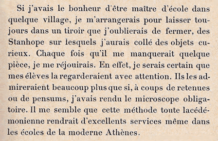 Nous n'avons pas voulu choisir entre les deux rédactions de Wilfrid de Fonvielle évoquant le microscope Stanhope. On découvre le texte de gauche sous le titre "LE MONDE INVISIBLE" et celui de droite sous le titre "LES MERVEILLES DU MONDE INVISIBLE". Le second ouvrage, qui renferme 120 illustrations, est une quatrième édition proposée par la Bibliothèque des Merveilles en 1874 (1ère édition en 1864). Le premier ouvrage, accompagné de seulement 25 illustrations, ne porte aucune date et est édité dans la collection de la Librairie d'Education de la Jeunesse sous une reliure de la Société pour l'Instruction Élémentaire. |