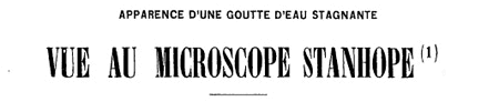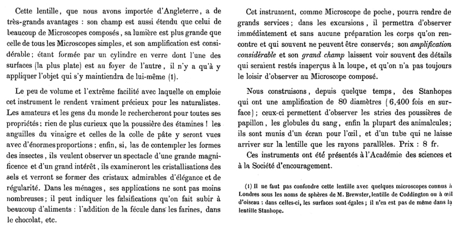 Le document qui suit est tiré de l'ouvrage de N.-P. LEREBOURS, dans son édition de 1846, "INSTRUCTION PRATIQUE SUR LES MICROSCOPES". Il présente le microscope Stanhope proposé par la maison LEREBOURS & SECRETAN, Opticiens de l'Observatoire, Place du Pont Neuf à Paris. Il s'agit d'un hors texte publicitaire dans lequel l'optimisme ne fait pas défaut... |