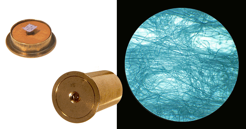 Nous examinons un fragment de gaze disposé contre la face plane de la lentille, après avoir humecté cette dernière pour assurer le contact. L'œilleton est remis en place sur son tube dont on dirige le diaphragme vers une source lumineuse. Ici, le champ ne dépasse pas 2 mm. |