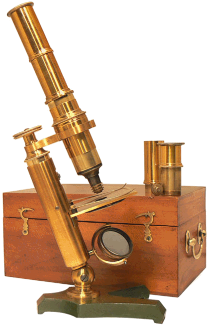 Dans la configuration de la photographie ci-dessus, la hauteur de l'instrument est de 30 cm, ce qui correspond à celle de "l'International Microscope", très ressemblant et proposé à la fin du XIXe siècle par B. KAHN & SON (New York) dans son catalogue OPTICAL and METEOROLOGICAL INSTRUMENTS Manufactured and Imported. Son histoire, les éléments qui l'accompagnent et le coffret nous amènent à penser que le microscope est une fabrication française des années 1870. |