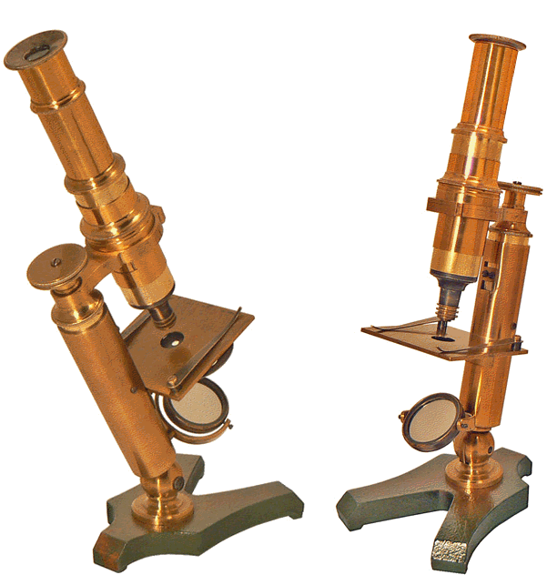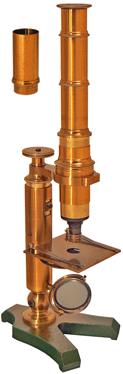 Le microscope possède un jeu d'allonges de 5 cm permettant d'augmenter la longueur du tube optique et par suite le grossissement. Bien entendu, l'opération est réalisée au détriment de la luminosité et du champ de vision. Il est doté de deux oculaires, faible et fort, et de deux objectifs n° 2 et 4. Le réglage grossier est réalisé par le coulant et le réglage fin par vis micrométrique. |