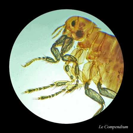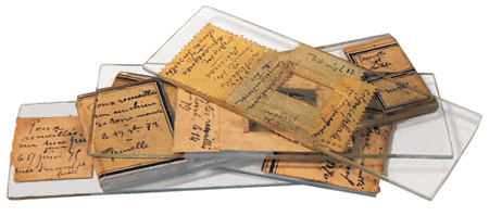 Le premier et peut être unique utilisateur de l'instrument était docteur vétérinaire dans les années 1870. Il n'est pas surprenant de trouver, dans le coffret, quelques lames de parasites d'animaux qu'il a lui-même préparées. Certaines, assez bien conservées, sont exploitables. Attention, toutefois, aux démangeaisons ... |
