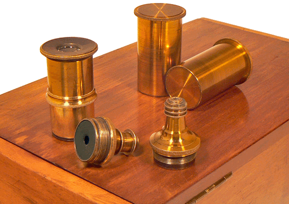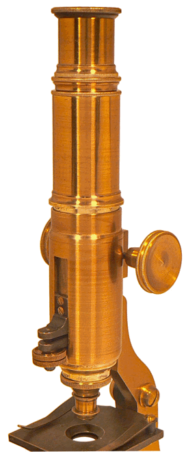 Le réglage primaire du microscope est assuré par système classique de pignon-crémaillère. L'optique est portée par deux tubes coaxiaux. Celui dont le diamètre est le plus grand reçoit l'oculaire alors que l'objectif est vissé à la base du tube intérieur, plus court. Deux petites pattes en forme d'équerre sont fixées, chacune à l'un des tubes. Elles sont reliées entre elles par une vis que commande une petite roulette moletée. La rotation de la roulette provoque le déplacement vertical de la patte inférieure fixée au tube intérieur. Par suite, cette manœuvre entraîne l'objectif sans déplacer l'oculaire : c'est un dispositif de mise au point fine que l'on rencontre surtout sur les instruments anglais du XIXe siècle. |