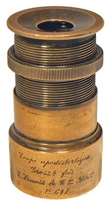 Il s'agit d'une loupe de mise au point qu'utilisaient, autrefois, les photographes. Elle renferme un doublet constitué d'un ménisque divergent et d'une lentille biconvexe. Le système optique résultant, dont l'épaisseur est réduite au minimum et dont les verres sont d'espèces différentes, contribue à la planéité du champ et à la suppression des effets de distorsion d'où le nom donné par Krauss, à l'instrument. On parlerait probablement aujourd'hui de loupe orthoscopique, c'est-à-dire donnant une image géométriquement semblable à l'objet. |