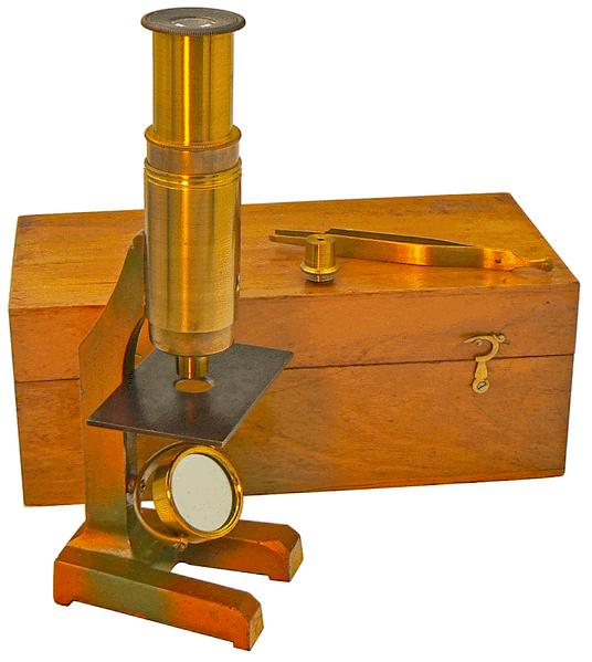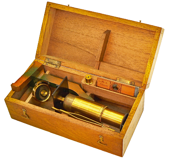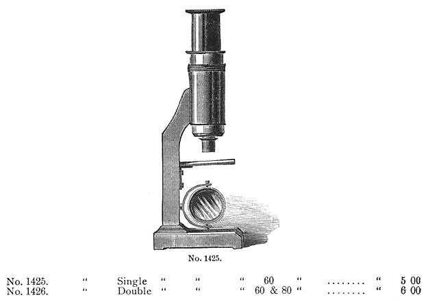 On rencontre ce petit microscope dans le catalogue "BUSIEST HOUSE IN AMERICA" de 1896 et en 1915 chez B. A. & Co, CHICAGO. Sa hauteur minimum est égale à 17 cm. Il est livré avec deux objectifs permettant des grossissements de 60 et 80 fois. Il est probablement de fabrication française. |