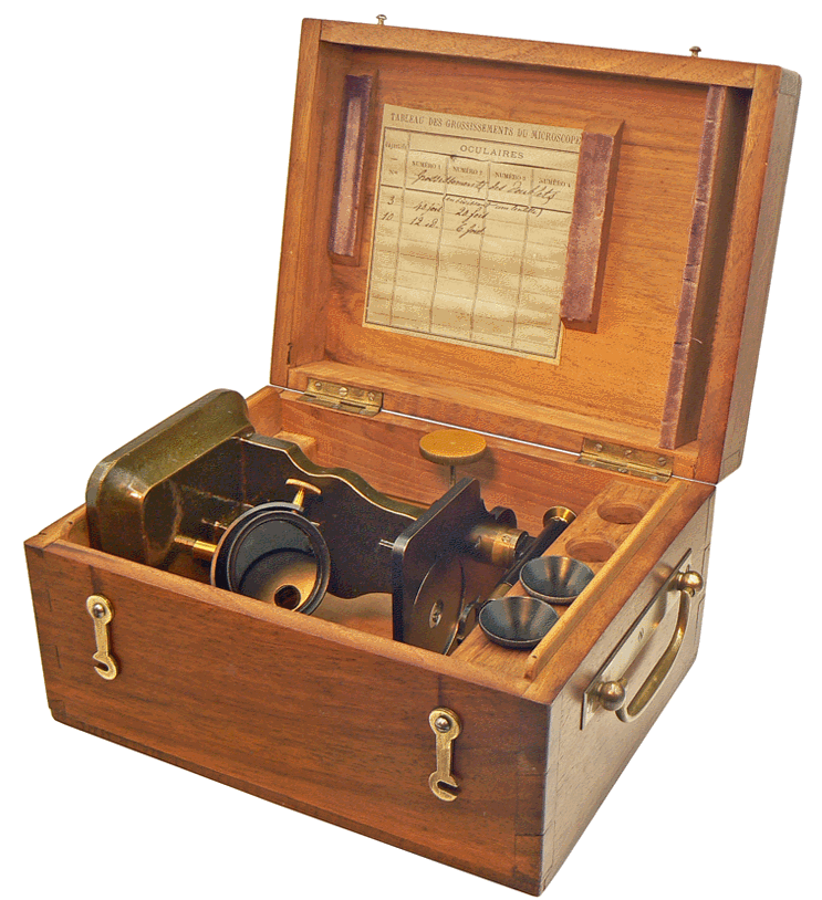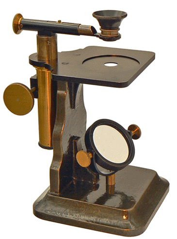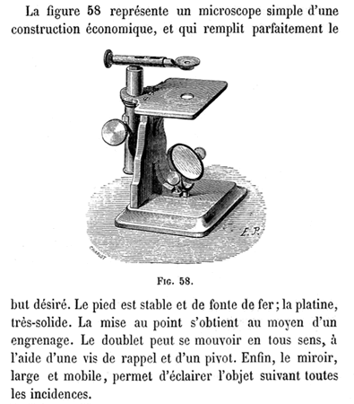 Avec son nouveau doublet, le microscope est identique à celui de la figure 58 de L'ÉTUDIANT MICROGRAPHE par Arthur CHEVALIER dans la seconde édition de 1865, ou à celle du catalogue de 1885 : |
