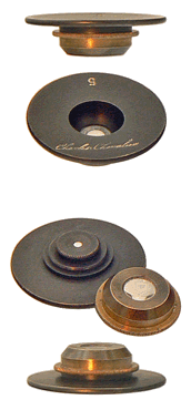 Le doublet optique, inventé par WOLLASTON en 1820, est composé de deux lentilles plan-convexes à face plane tournée vers l'objet ce qui réduit les aberrations de sphéricité et de réfrangibilité résultant de l'emploi de la lentille biconvexe unique utilisée jusque-là. En 1830, Charles CHEVALIER améliore ce système optique en éloignant le foyer afin de laisser un espace suffisant aux instruments de dissection. On y retrouve les deux lentilles plan-convexes, la première, près de l'objet, de plus grand diamètre que la seconde dont elle est séparée par un diaphragme. Les lentilles sont accouplées par leur monture à vis et leur écartement est faible et invariable. La monture supérieure porte une large collerette noire qui protège l'œil de toute lumière parasite. La forme la plus connue des doublets de Charles Chevalier est différente de celle des deux articles qui accompagnent notre instrument. Le diamètre de leur monture est identique puisqu'ils se montent sur tous les microscopes du constructeur mais ils sont beaucoup plus courts et la collerette, presque plate, est marquée "Charles Chevalier". |