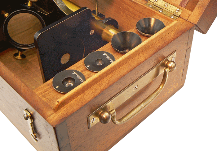 Le microscope dans son coffret en noyer de 22 x 17 x 12 cm |