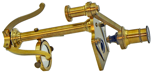 THE GOLUB COLLECTION (University of Californy, Berkeley) renferme un microscope, de finition argentée, possédant le même statif (No.140 - Compound Microscope made of Silver) : le tube optique, plus important, est muni d'un système de mise au point par pignon et crémaillère. |