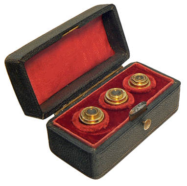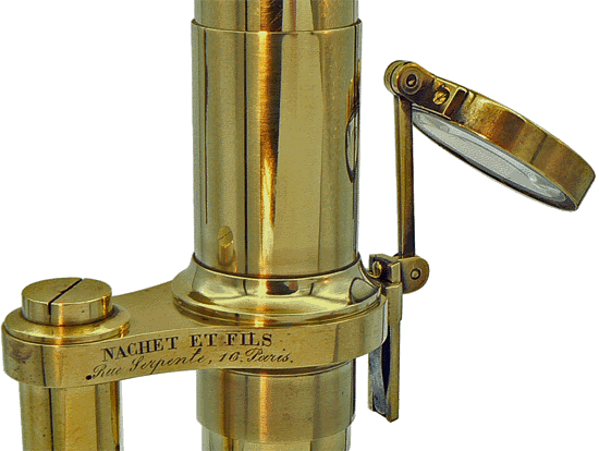 L'écrin protège trois objectifs permettant, avec autant d'oculaires, de moduler le grossissement. La mise au point du microscope est réalisée par le coulant, le réglage fin étant assuré par vis micrométrique dont la commande est située à l'arrière et sous la platine. Un miroir concave et un disque diaphragme permettent l'éclairage des préparations par transparence. Une loupe articulée escamotable concentre la lumière sur le dessus des objets opaques. |