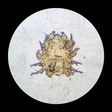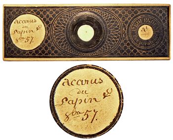 Cette lame d'acarien, l'acarus du lapin, issue de l'atelier de Joseph BOURGOGNE se trouvait dans le coffret du microscope. Elle a été préparée en octobre 1857. |