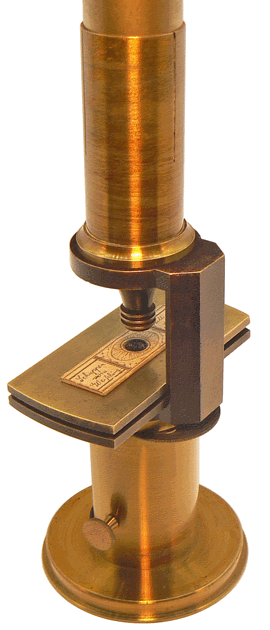 Une "cuve à fond de glace et parois de cuivre" telle que celle qui est évoquée par Arthur Chevalier en 1864 dans L'ETUDIANT MICROGRAPHE, accompagne l'instrument. Elle est utilisée pour les observations en milieu liquide et, par exemple, pour l'examen de la circulation du sang dans les nageoires des très petits poissons ou dans la queue des têtards de grenouille. |