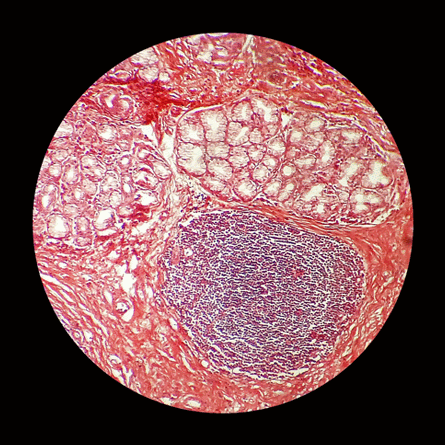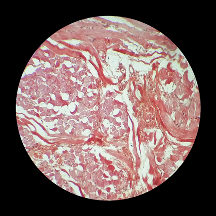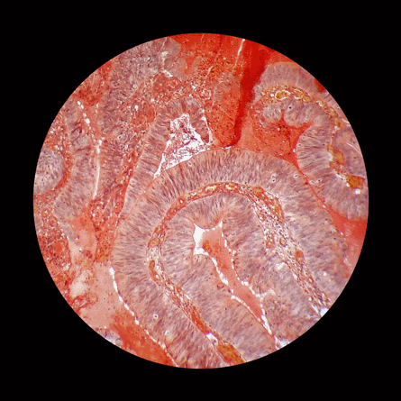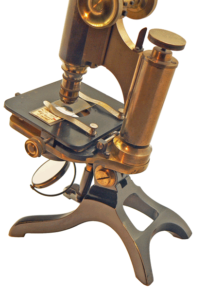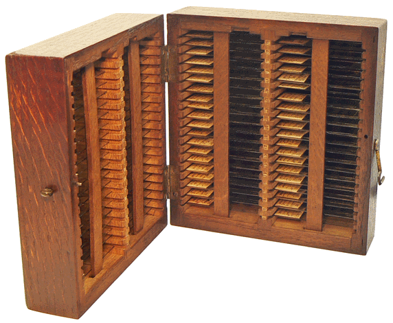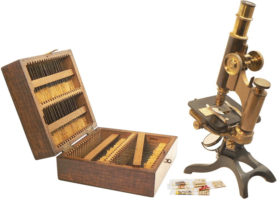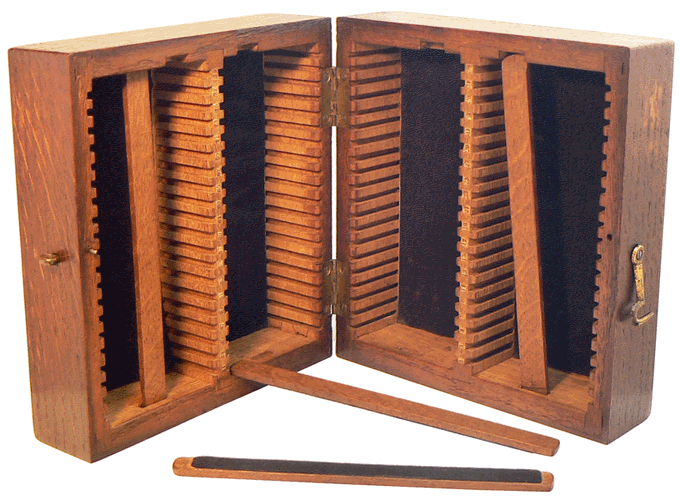 Aujourd'hui, le coffret renferme une collection de coupes histologiques réalisées en 1926 à l'Hôpital Saint Michel à Paris. Nous avons photographié quelques-unes de ces lames portant les fines tranches de tissus biologiques humains préparées à partir de prélèvements sur des patients. Nous ne sommes pas à même de reconnaître les zones médicalement intéressantes et, pour les photographies, nous avons privilégié le jeu des formes et des couleurs : c'est une façon de remarquer la qualité des préparations presque centenaires. Le microscope que nous avons utilisé est plus actuel que l'élégant "Nachet à pied anglais" recommandé, autrefois, pour les travaux d'histologie et de bactériologie. |