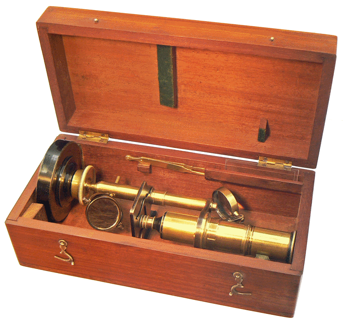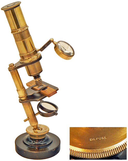 Aucune marque ne figure sur l'instrument. Seule la mention "DEPOSE" est gravée sur le bouton moleté en laiton constituant, avec le socle en fonte sur lequel il est vissé, un inhabituel dispositif de blocage de la colonne du microscope. |