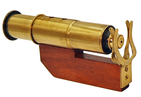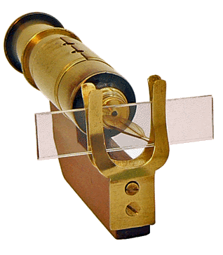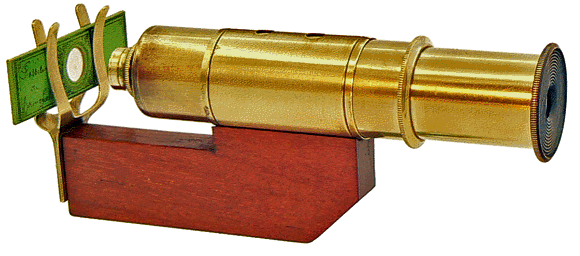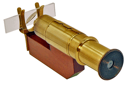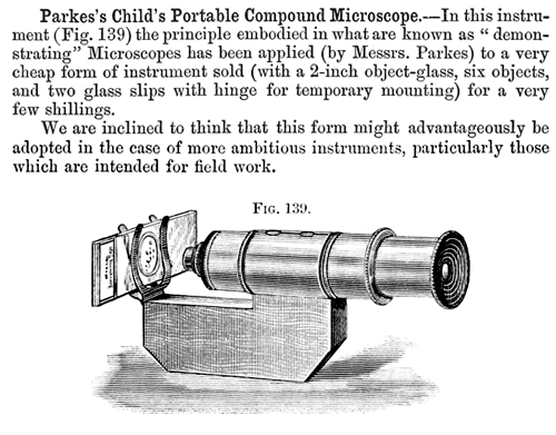 "JAMES PARKES AND SON" propose l'instrument dans son catalogue de 1857 sous le titre Children Portable Compound Microscope. On peut y observer les préparations du commerce ou, par exemple, des constituants de fleurs, des pattes et ailes d'insectes, placés entre deux lames en verre maintenues l'une contre l'autre par des pinces en forme de lyre. Ces pinces et le support du tube optique, sont fixés à une potence en acajou verni. |