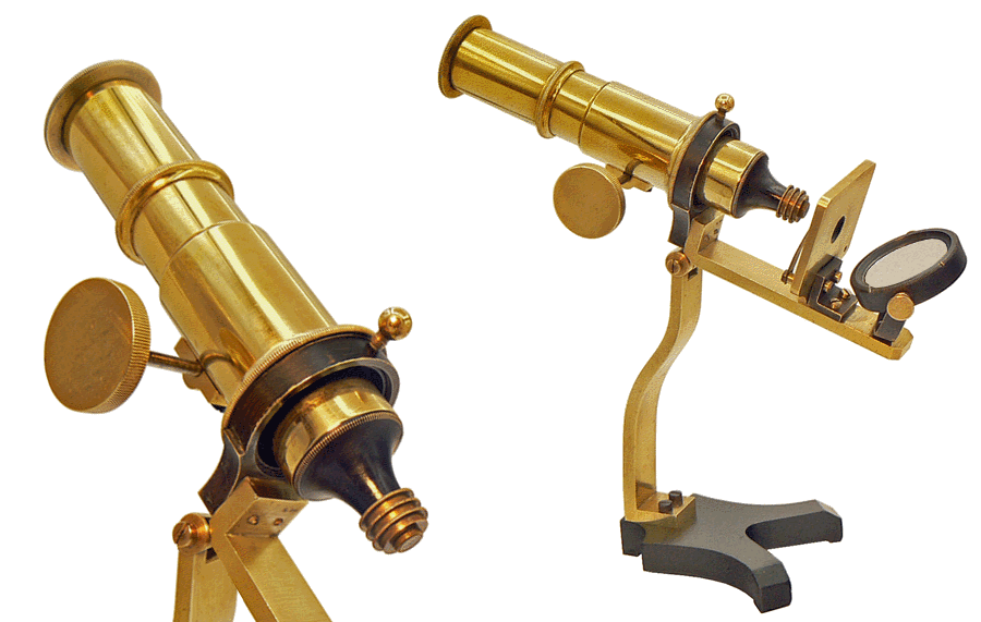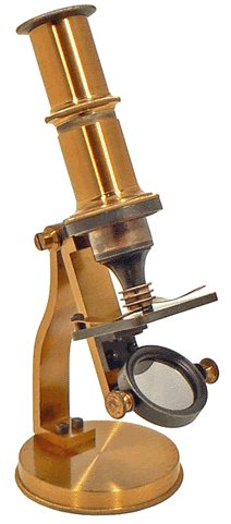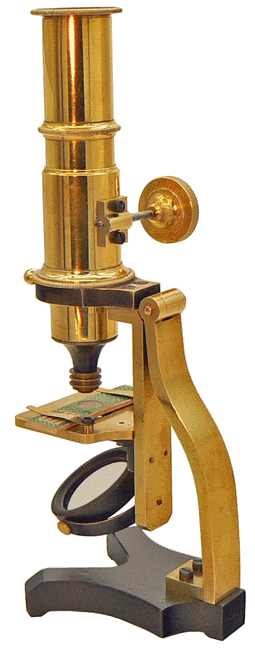 Le Compendium renferme un deuxième microscope du même type, plus petit et plus simple, que l'on peut retrouver en cliquant sur l'image de gauche. Il est identique en ce qui concerne sa colonne plate incurvée ainsi que son articulation, mais le pied - en forme de Y et en fonte chez le modèle de la page actuelle - est circulaire et en laiton lesté de plomb. Ce petit microscope possède le même objectif scindable, caractéristique des modèles français de la fin du XIXe siècle. Aucune marque ne figure ni sur l'un ni sur l'autre de ces deux instruments... |