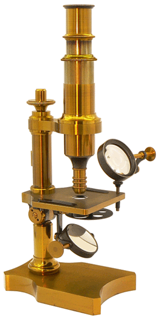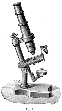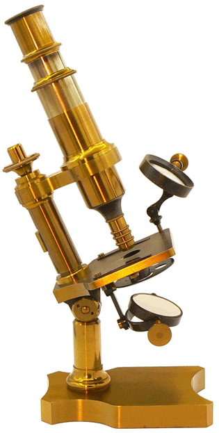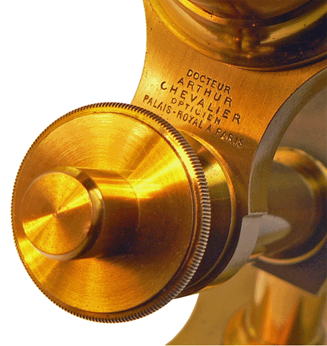 Concernant le spécimen présenté sur notre page, l'articulation du miroir et celle de la loupe pour l'éclairage des corps opaques apparaissent particulièrement conformes au dessin représentant le microscope de Bouquette. Il est admis que ce dernier fournissait la maison CHEVALIER en ce qui concerne certains instruments... |