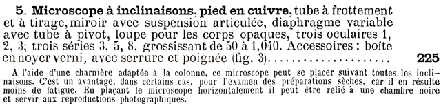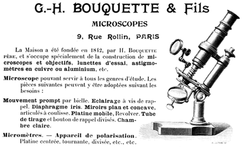 La maison BOUQUETTE, spécialiste dans la construction de "Microscopes achromatiques de précision pour l'étude de la Médecine, la Pharmacie, la Botanique, etc" propose, à la même époque que CHEVALIER, un instrument identique au "n° 5 à inclinaisons". |