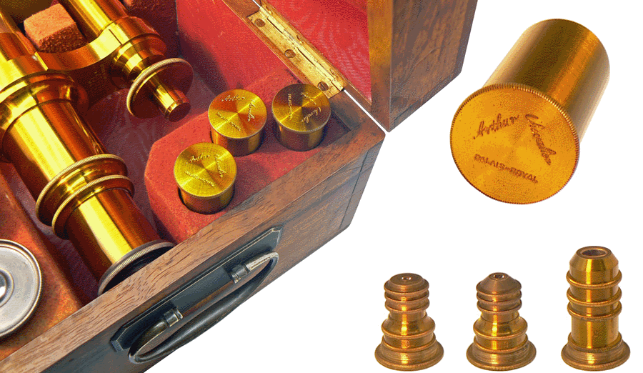 Lorsqu'ils ne sont pas utilisés, les objectifs sont immobilisés dans trois petits étuis cylindriques portant la marque suivant les côtés d'un triangle : Arthur Chevalier Palais-Royal. |