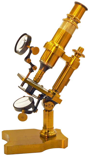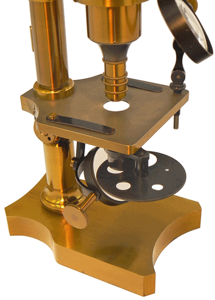 L'éclairage par transparence est assuré par un miroir concave articulé permettant la lumière oblique et un disque diaphragme sur pivot qui s'insère entre le miroir et la platine. Au-dessus de la platine, une loupe à double articulation permet de focaliser la lumière sur les objets opaques. |