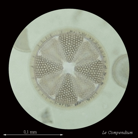 A travers le microscope équipé de l'objectif n° 5 et de l'oculaire n° 2, menant à un grossissement de 500 fois, nous avons photographié cette diatomée fossile, élément d'une lame préparée W. WATSON & SONS à la fin du XIXe siècle. |