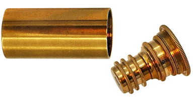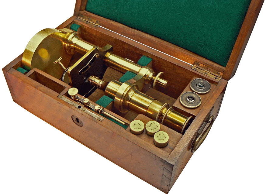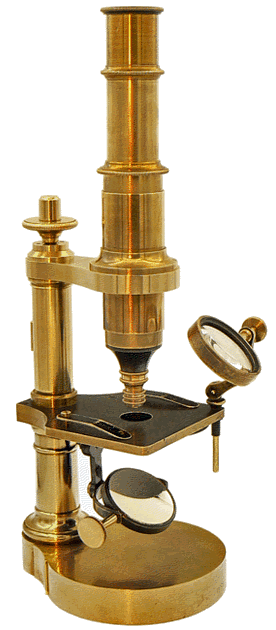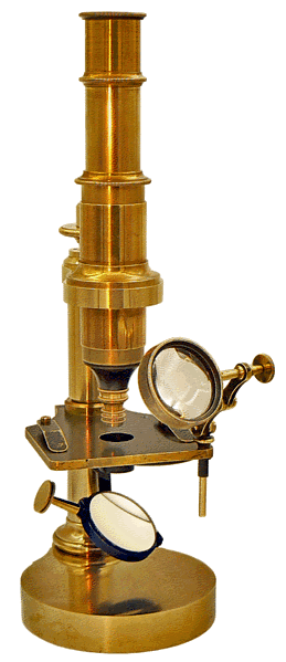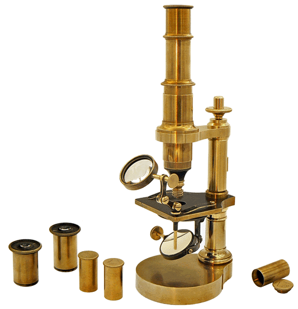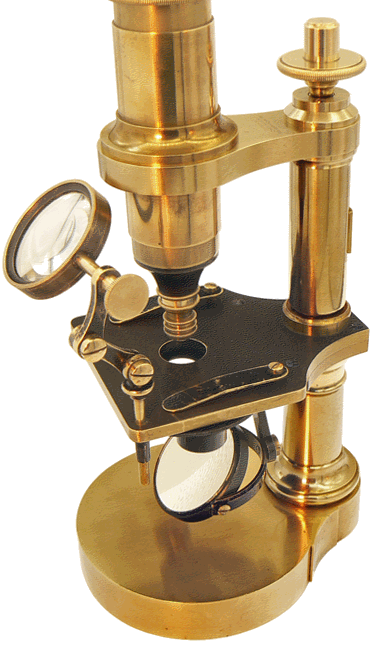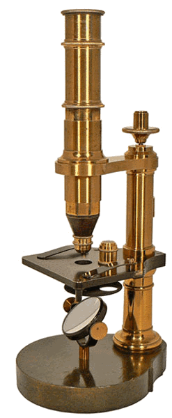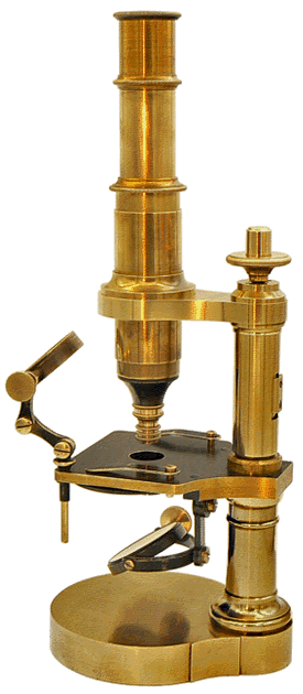 Microscope droit, pied en cuivre. Hauteur minimum 30 cm. Les éléments du microscope sont marqués du chiffre "6" - Vers 1870 |