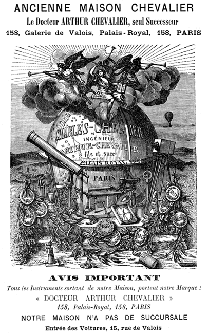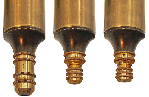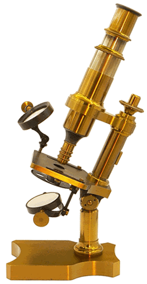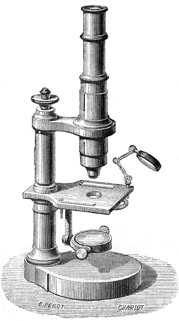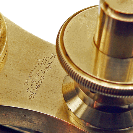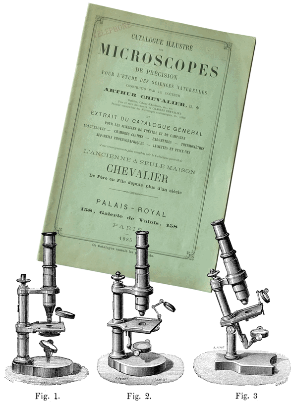 En 1885, Arthur CHEVALIER propose, sur les premières pages son catalogue, trois instruments "pour l'observation, et les laboratoires". A gauche (Fig. 1), le modèle 1, microscope droit au pied en fonte, dont deux variantes, les modèles 2 et 3, diffèrent uniquement par leur dotation optique. Au milieu, (Fig. 2), le microscope droit au pied en cuivre, modèle 4, décrit sur la présente page et permettant des grossissements dépassant le millier de fois. A droite, la Fig. 3 est celle du microscope à inclinaisons, modèle 5, aux performances optiques identiques, mais d'utilisation plus agréable. Ces trois microscopes sont présents dans le Compendium. Il suffit de cliquer sur les images qui suivent pour les rencontrer... |