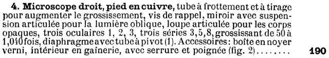 "Ce modèle est parfait pour tous les genres d'études : l'histologie, la médecine légale, la botanique, etc. Cet instrument, que nous avons fourni au laboratoire des Hautes Etudes, à l'amphithéatre des hôpitaux, à l'Ecole de pharmacie, etc., renferme tous les avantages que l'on peut désirer (...) C'est un des modèles les plus employés et qui a été adopté par les savants français et étrangers." |