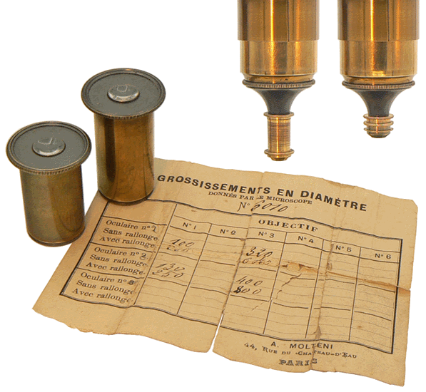 Avec la dotation optique actuelle, c'est-à-dire avec deux oculaires n° 2 et 3 et deux objectifs n°1 et 3, le grossissement varie entre 100 et 800 fois. Les valeurs les plus élevées sont obtenues avec tirage de la rallonge du tube optique. |