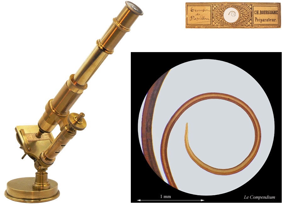 L'instrument est accompagné de quelques préparations dont cette lame de Trompe de Papillon réalisée par Charles BOURGOGNE microscopiste du XIXe siècle. Sur notre photographie, seule la partie terminale de la trompe se trouve dans le champ d'observation. |