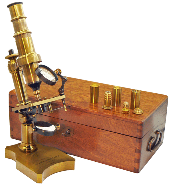 Microscope moyen modèle, accompagné de ses objectifs - hauteur minimum 28 cm - 1873 - Tous les élément sont marqués du chiffre 3 |