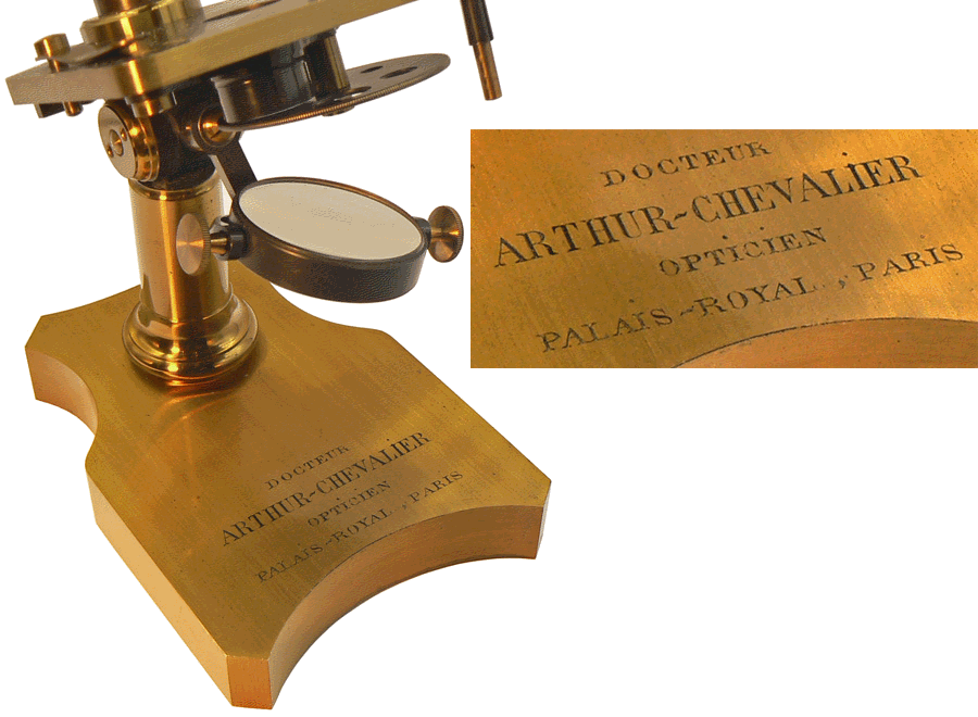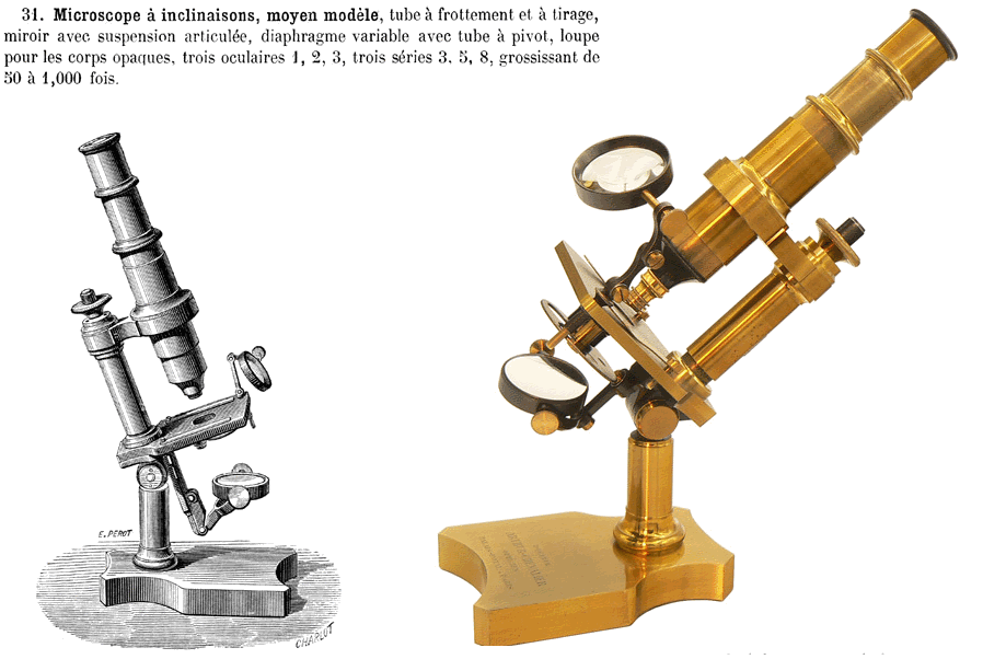 Près du dessin du catalogue du Dr Arthur Chevalier de 1872, la légende précise que "le modèle est très apprécié des gens du monde et des savants, car l'inclinaison permet de continuer les observations sans causer de fatigue". Dans son coffret en noyer, il est alors vendu 215 Francs. |
