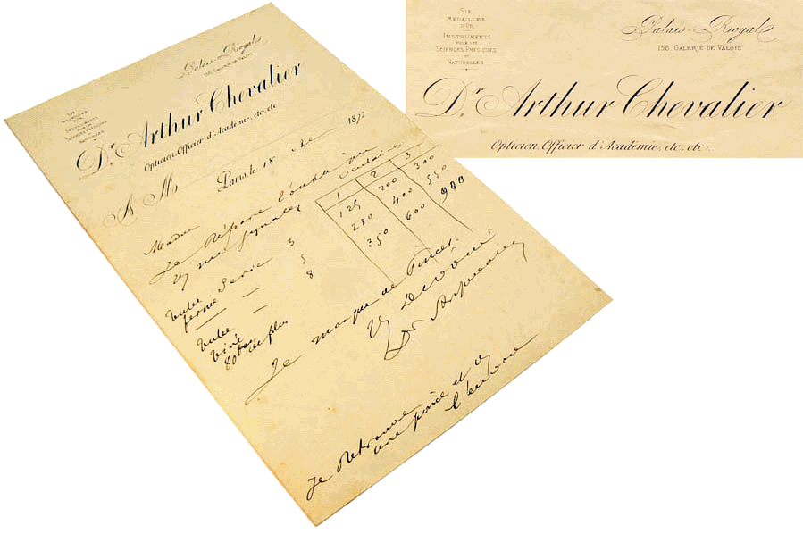 L'instrument est accompagné du catalogue des microscopes de 1872 et d'une lettre manuscrite à en-tête de la maison du Docteur Arthur CHEVALIER, datée du 18 xx 1873 : |