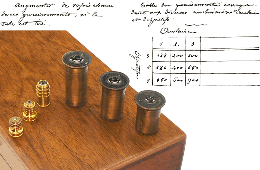 Les combinaisons entre les objectifs 3, 5, 8 et les oculaires 1, 2 et 3 permettent des grossissements de 125 à 900 fois. Le tirage du tube optique les augmente de 80 fois. Les objectifs scindables donnent la possibilté de réduire le grossissement minimum à 50 fois ce qui est intéressant lorsque, par exemple, on veut observer des petits insectes dans leur totalité. |