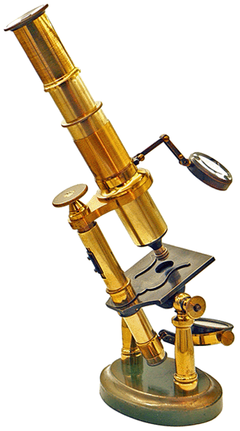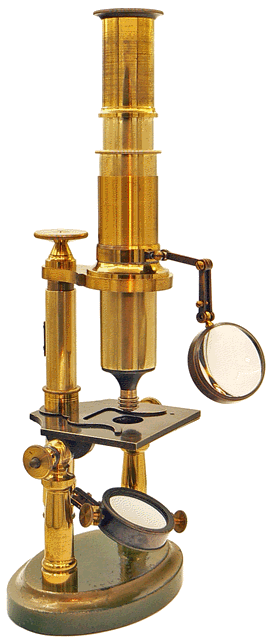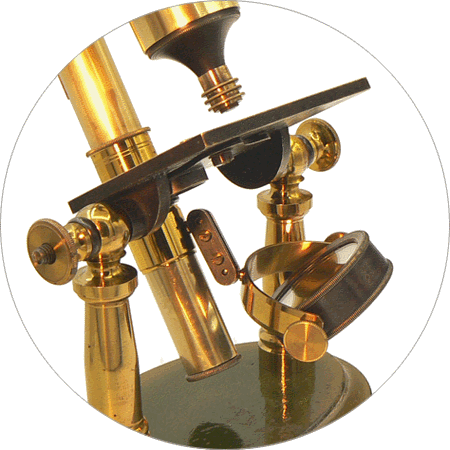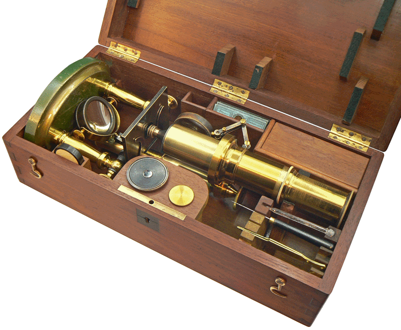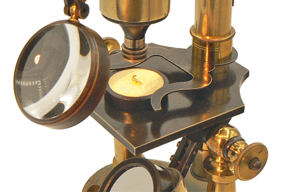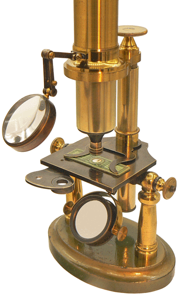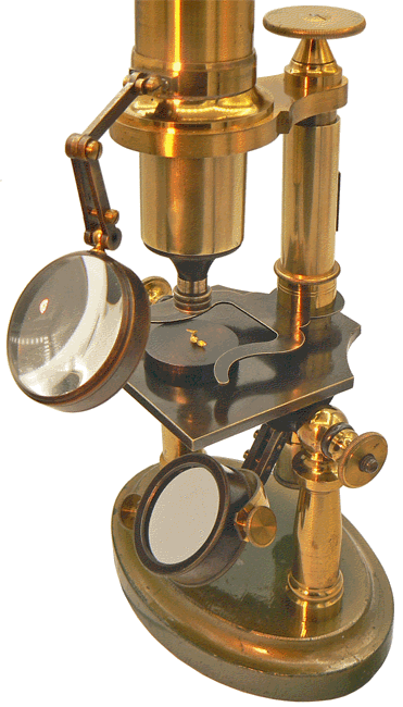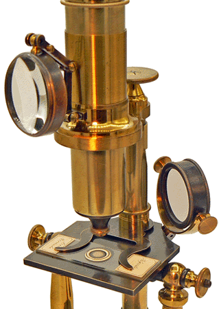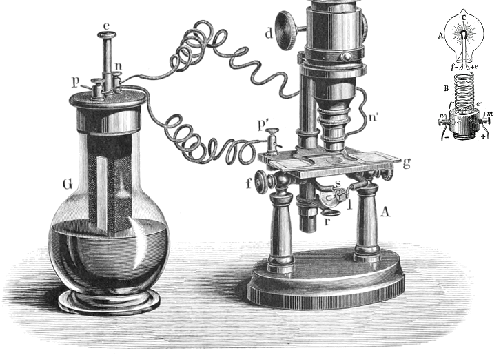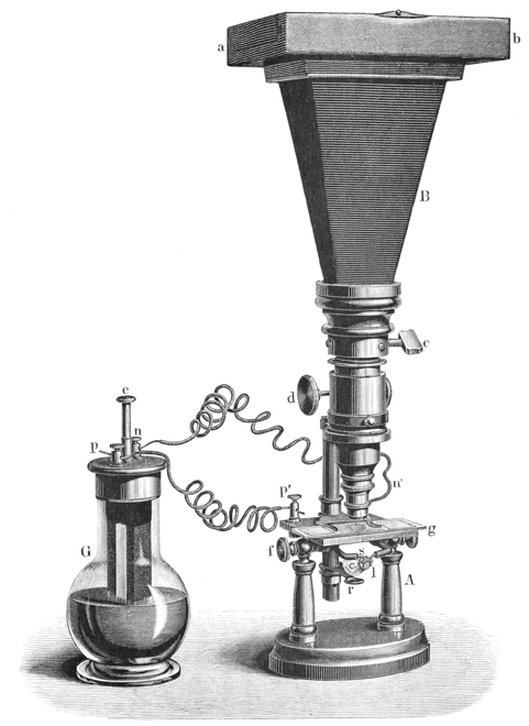 Ce modèle de microscope a été choisi pour illustrer les premiers dispositifs de photographie microscopique avec éclairage électrique. Miroir et loupe d'éclairage des objets opaques sont retirés (la rotule de l'articulation de la loupe est restée en place). Sous la platine est positionnée une petite ampoule à incandescence alimentée par une pile de Grenet. |