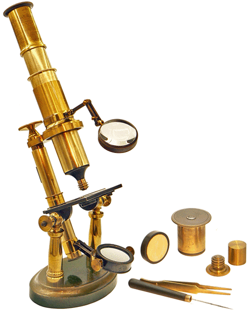 Près du microscope, l'objectif et l'oculaire supplémentaires, la "dame" ainsi que les instruments classiques, pince et aiguille fine montée. |