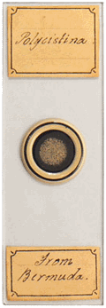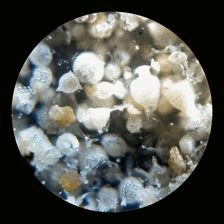 Le bras articulé du miroir est monté sur une bague qui pivote et coulisse sur le bas de la colonne optique ; cela permet de positionner le miroir en arrière et au-dessus de la platine. Ainsi, il est possible, d'obtenir un éclairage rasant sur les objets ce qui favorise le contraste, comme, par exemple pour l'obtention de cette image d'une lame de radiolaires en lumière naturelle rasante. |