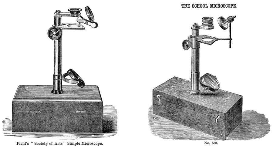 A gauche, présenté dans l'édition de 1868 de l'ouvrage de William B. Carpenter, The Microscope and its revelations, le microscope simple de Robert Field & Son, créé pour l'observation des fleurs et des insectes. En 1855, son constructeur à reçu le "Society of Arts Prize Microscopes", pour la qualité de l'instrument et son prix raisonnable. Beaucoup se sont, par la suite, inspirés du modèle. C'est le cas de L. Casella (Londres), James W. Queen & Co (Philadelphie) et, ici à droite, de R. & J. Beck (Londres) pour The School Microscope sorti du catalogue de 1882. Notre spécimen ressemble particulièrement à ce modèle même si la loupe d'éclairement des objets opaques fait défaut. |