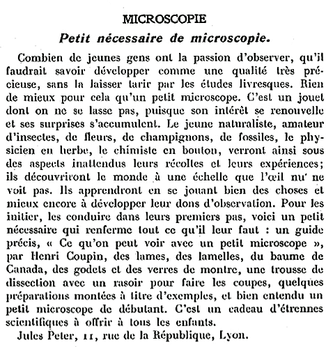 Dans la revue La Nature du 2ème semestre 1938, Jules Peter, Opticien Lunetier à Lyon présente un Petit nécessaire de microscopie destiné aux jeunes. Nous découvrons aujoud'hui, c'est-à-dire en décembre 2023, que nous avons réuni sur notre présentation de 2020 soit plus de quatre vingts ans plus tard, le même microscope
