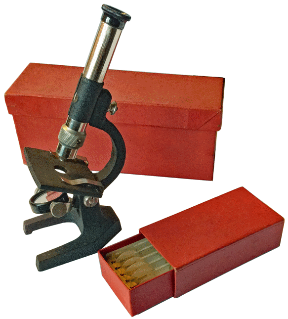 Il s'agit probablement d'une des premières versions du petit microscope CADY que l'on pouvait acquérir à la fin des années 1930. Près de lui, nous avons posé le livre d'Henri COUPIN, "CE QU'ON PEUT VOIR AVEC UN PETIT MICROSCOPE", devenu depuis sa parution en 1897 la référence pour les micrographes débutants. Il s'agit, ici, de l'édition de 1945. D'autres ont suivi... |