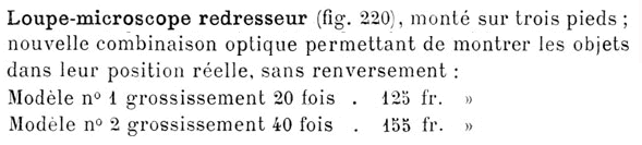 La principale caractéristique de ce microscope est la présence, entre l'objectif et l'oculaire, d'un système optique constitué par un groupement de deux lentilles qui a pour fonction de redresser l'image fournie par l'objectif puis arrivant jusqu'à l'œil. Ce dispositif permet d'observer les objets dans leur véritable position et, en particulier, de suivre le mouvement réel des instruments lors d'une dissection. Ce n'est pas le cas avec un microscope composé ordinaire qui donne une image renversée en mettant à droite ce qui est à gauche et en haut ce qui est en bas... |