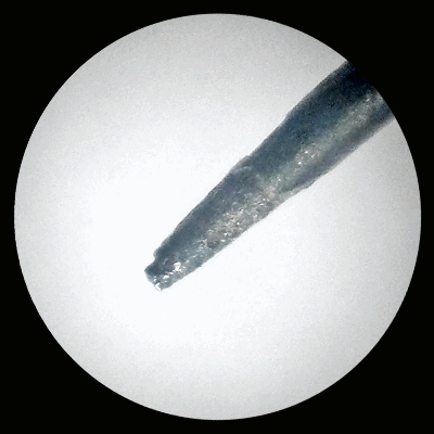 L'aiguille montée est, à l'œil nu, fine et pointue... |