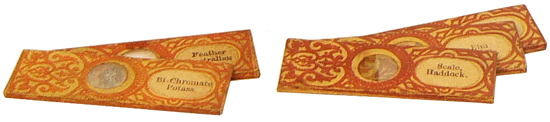 Des petites préparations - elles mesurent à peine 5 cm - accompagnent le microscope. Les lames sont en verre et les lamelles couvre-objet sont en mica. Seule la partie supérieure des lames est recouverte de papier. |