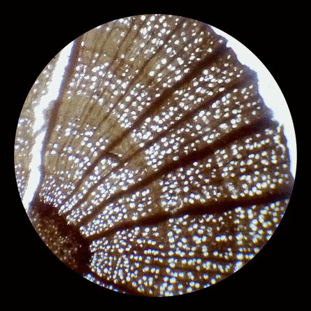 Sur l'image de gauche, la configuration optique est identique à celle du microscope de poche. A droite, avec l'objectif plus puissant, le grossissement approche 50 fois. |